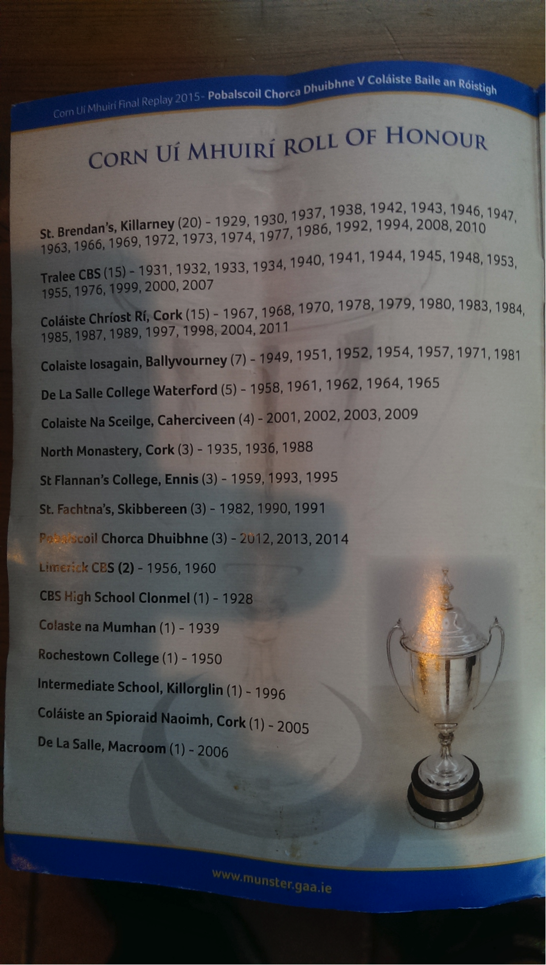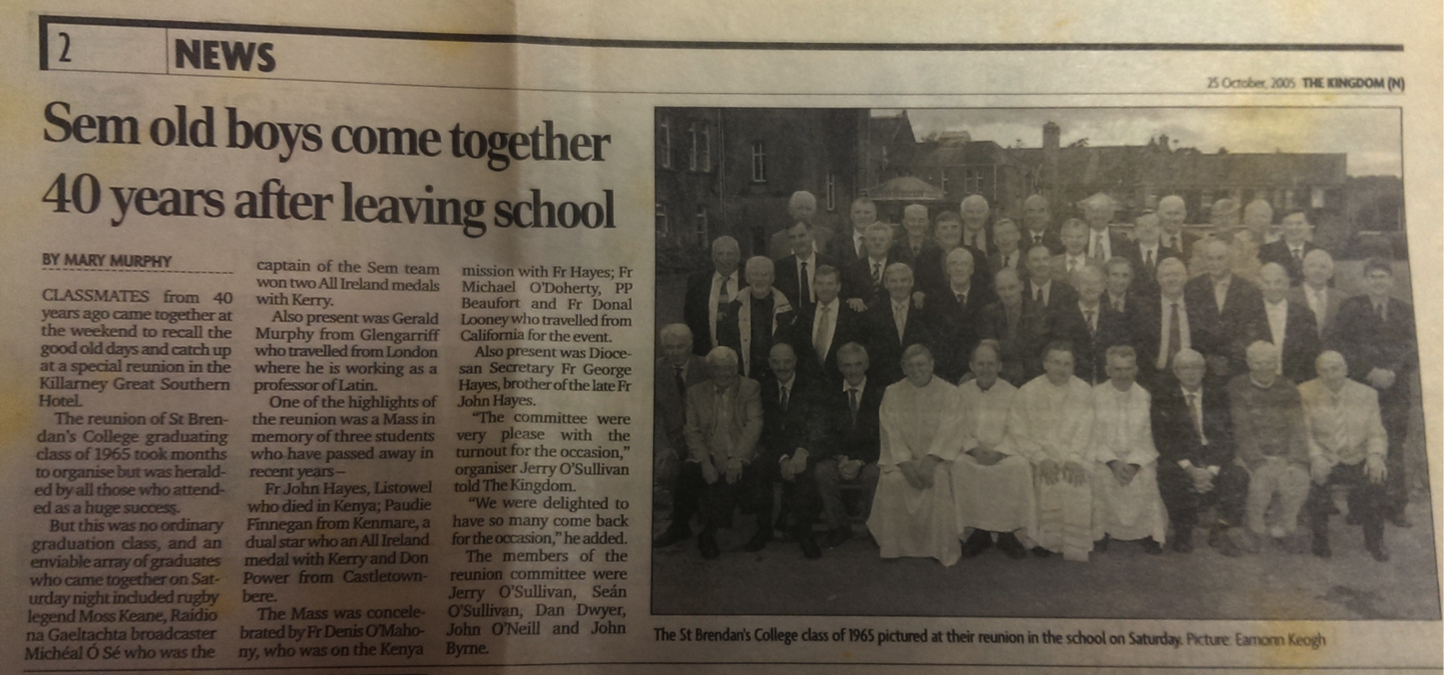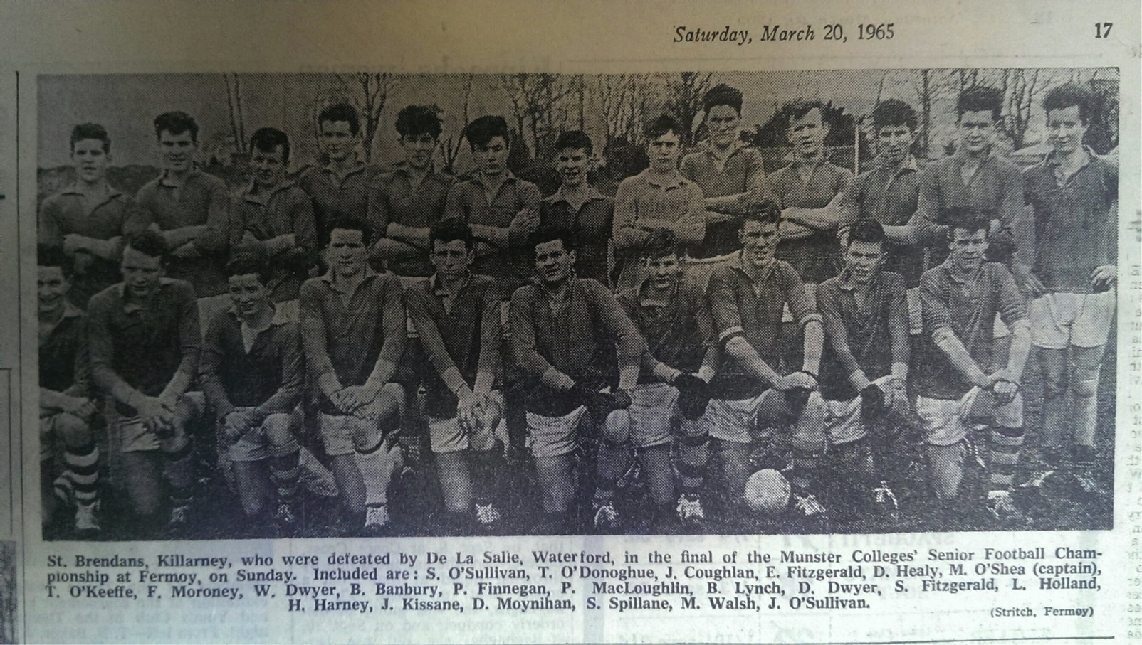 1965 year 1965 class 1965 class team ?Team ?Year ?Team ?Year Munster Colleges Senior Final, 1965 Newspaper Photo With Names in Order [ Corn Uí Mhuirí Roll of Honour ] Scholarship winners offline version Photos from 50s and 60s, available from Macmonagle NEW Several Lists (pertaining to years '62-'63 '63-'64 and '64-'65 ) provided by (then Fr., now Archbishop emeritus) Dermot Clifford |