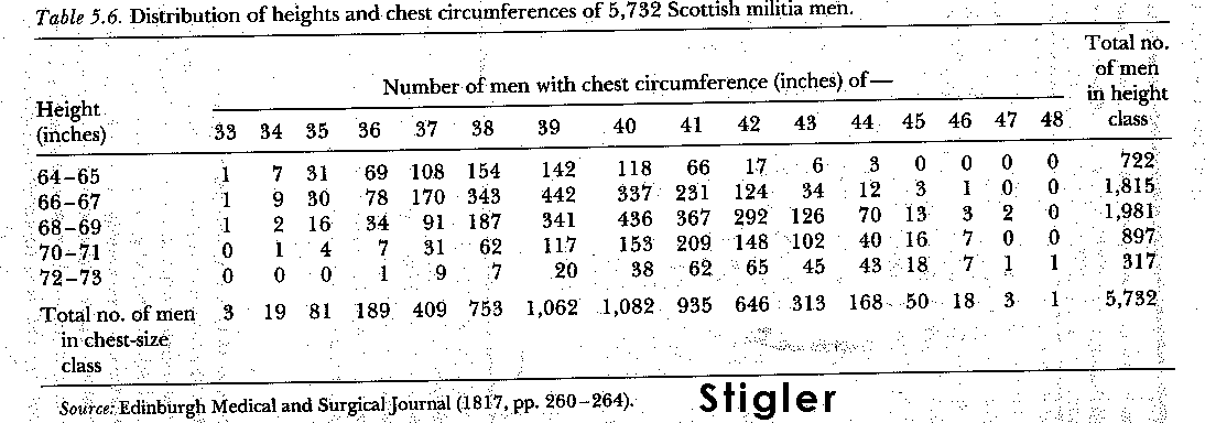 Heights and Chest circumferences of Scottish militia men (Quetelet/Stigler)